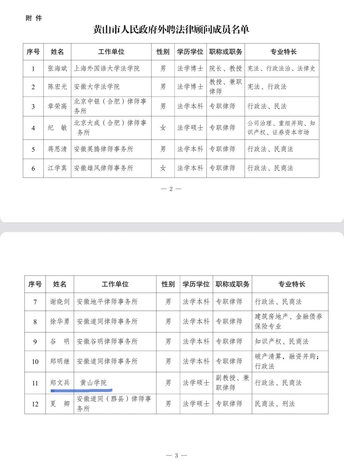 据悉,黄山市系我省内较早建立政府法律顾问制度的地市,本届法律顾问为黄山市政府第五届法律顾问,本届市政府法律顾问共12人,由来自省内外的法学专家和执业律师组成。我院法学副教授郑文兵自2004年获聘黄山市政府第一届法律顾问以来,至今已连任四届,在法治政府建设过程中,认真履行职责,提交的法律意见和工作建议得到了多方的认可和好评,曾获评黄山市首届“十大法治人物”,为推进黄山市域治理体系和治理能力现代化发挥了积极作用,树立了我校教师的良好社会形象。