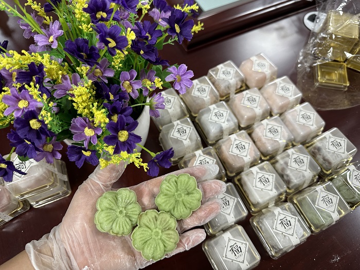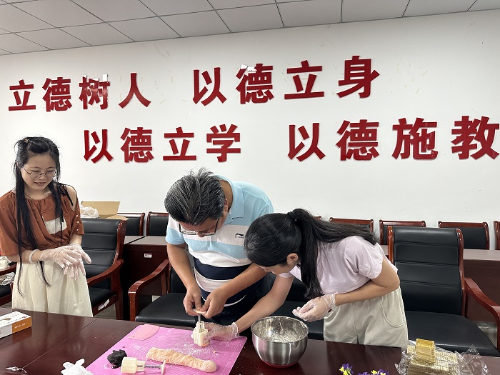 活动现场,分工会提前准备了做冰皮月饼需要用的面粉、馅料等原料和工具。和面、揉月饼皮、放馅料、揉圆、模具压制,一道道工序,大家一起动手,一边学一边做,做成了一个个晶莹剔透的冰皮月饼。活动过程中,教职工们积极参与,互相切磋,交流经验,其乐融融。