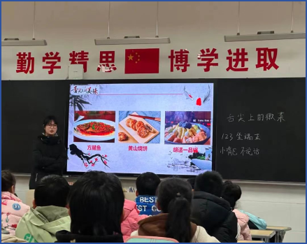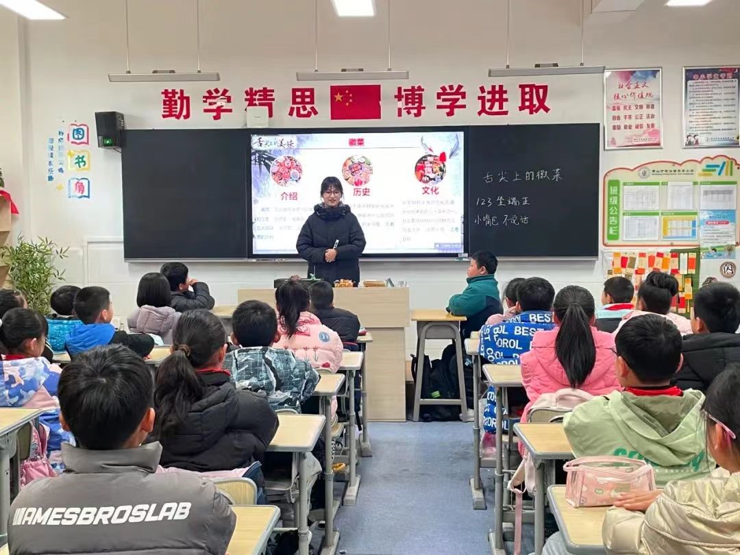 为了激发小学生们的学习兴趣,志愿者们以徽菜历史故事为题材,向学生们详细介绍了徽菜的特点、起源与传承,对徽州臭鳜鱼、徽州一品锅等徽菜代表菜品的烹饪技艺进行了讲解,让同学们了解了许多关于徽菜的知识。图文并茂的教学内容、丰富多样的教学手段令小学生们听得津津有味。