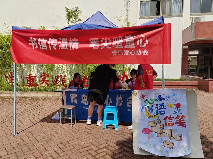 4月27日,必赢线路检测3003no1挂靠社团一一青鸟爱心协会,在率水校区与横江校区同时举办“心语信笺”活动。