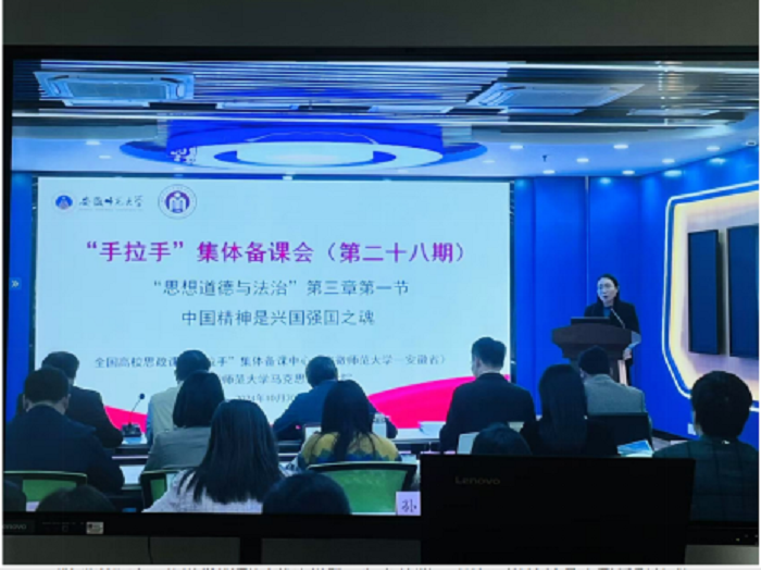 第一环节,集体观摩由安徽师范大学必赢线路检测3003no1主办的“手拉手”集体备课会(第28期)线上直播活动。备课会上,来自安徽工程大学必赢线路检测3003no1教师季雨亭、芜湖学院必赢线路检测3003no1教师方宝华、安徽师范大学必赢线路检测3003no1教师龚伟分别围绕“中国精神是兴国强国之魂”主题以“同课异构”方式先后进行“说课展示”。之后,三位专家对老师们的展示作出点评,安徽师范大学必赢线路检测3003no1教授路丙辉作备课小结。本次集体备课活动在安徽师范大学必赢线路检测3003no1举行,同步在教育部集体备课中心“云上大练兵”平台进行直播。