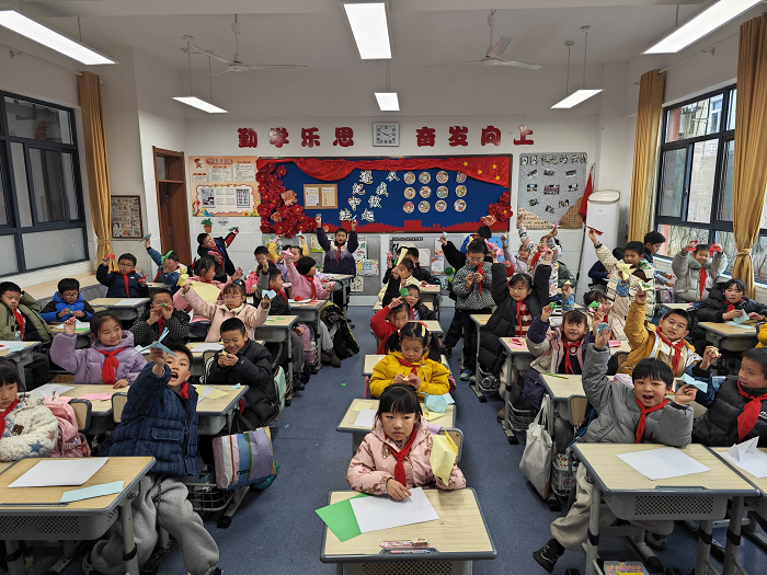 小学生们热情高涨,纷纷投入到折纸创作中。主持者鼓励孩子们先尝试基础的折纸技巧,如纸鹤、小船等,随后引导他们自由发挥,结合个人想象,对基础折纸进行改造和创新。有的孩子将简单的纸鹤装饰成五彩斑斓的“彩虹鹤”,有的则将小船改造成了一个微型的“探险船”,上面还摆放着用纸片做成的小人偶,充满了童趣和创意。最后,到了交流分享环节,孩子们高举作品,眼中满是自豪,孩子们纷纷表示,这次活动让他们感受到了手工艺术的快乐。